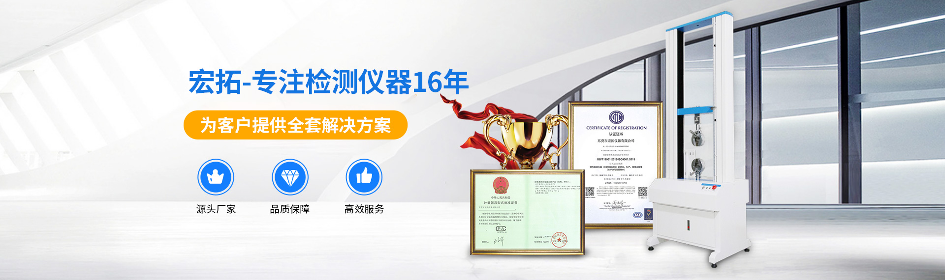 宏拓儀器重視生產過程中的質量管控,必須通過ISO9001:2015質量管理體系管理認證 目前主要產品線有:拉力試驗機、橡塑膠類儀器、環境檢測儀器、磨損類儀器、皮革鞋類儀器、紙品類儀器、箱包類儀器、電池類儀器、線纜與電工電器儀器、密度儀、水份測試儀、材料阻然性能測試儀等儀器